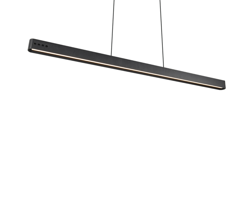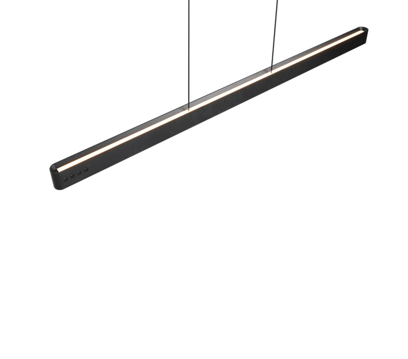 Zeer strakke moderne hanglamp Donegal led van de firma Trio lighting in een combinatie van zwart met acryl glas en uit gevoerd met een led bron van 40w 4650 lumen en komt overeen met 2700-6500 Kelvin. De lamp past perfect boven de eettafel in de woonkamer of keuken. De lamp heeft een lengte van 150 cm. De hanglamp wordt geleverd met afstandsbediening. De lamp kun je zelf verstellen in hoogte variërend van minimaal 40 cm tot maximaal 180 cm door de afstandsbediening. De licht kleur en licht sterkte is aan te passen door push dimmers op het armatuur en afstandsbediening.