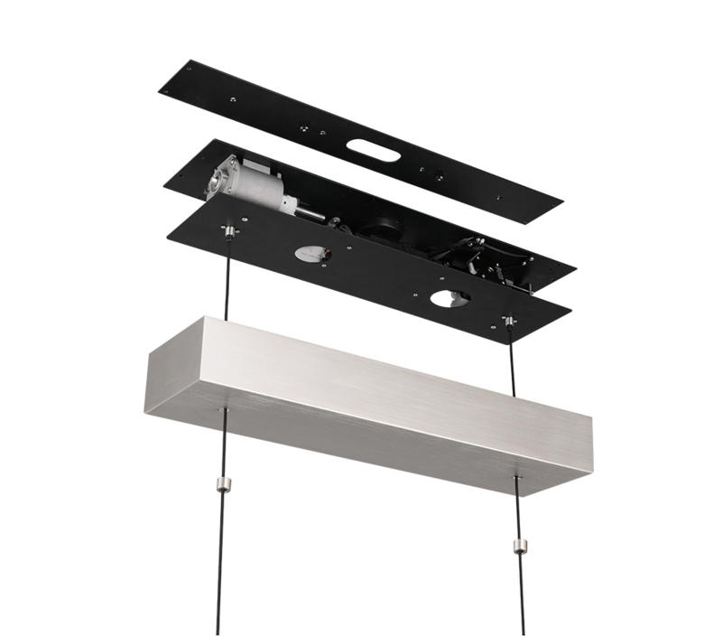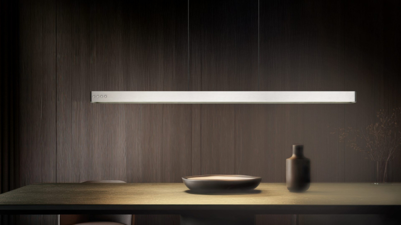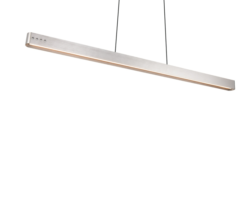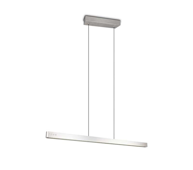 Zeer strakke moderne hanglamp Donegal led van de firma Trio lighting in een combinatie van mat nikkel met acryl glas en uit gevoerd met een led bron van 40w 4650 lumen en komt overeen met 2700-6500 Kelvin. De lamp past perfect boven de eettafel in de woonkamer of keuken. De lamp heeft een lengte van 150 cm. De hanglamp wordt geleverd met afstandsbediening. De lamp kun je zelf verstellen in hoogte variërend van minimaal 40 cm tot maximaal 180 cm door de afstandsbediening. De licht kleur en licht sterkte is aan te passen door push dimmers op het armatuur en afstandsbediening.